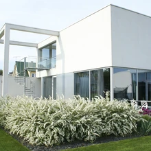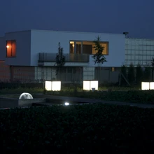 Maapind laskub majast eemale astmeliste muruterrassidena, mille tugimüürid on kaetud sama harjatud alumiiniumiga nagu maja fassaadki. Aia tagumisse ossa jäävad ka kunagise liivakasti kohale rajatud maasikapeenar, vaadet raamiv hekk kontpuudest ja mägimändidest ning nende vahele justkui skulptuuridena paigutatud valged kuubikud. Piimjast pleksiklaasist kastid on tegelikult oma jooniste järgi valmistada lastud valgustid, mis muudavad pimedal ajal aia ruumiliseks ja panevad selle koos veesilmaga elama.