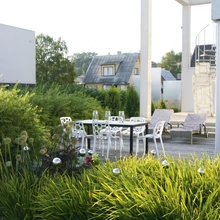 Kõige olulisemad ja kaunimad vaated aiale avanevad elutoast ja terrassilt, kus pere veedab suurema osa ajast. Et tagada aia ja maja ühenduslülina toimival terrassil väga privaatne olemine, on selle ümber aiakujundusõpetaja Reti Randoja-Mutsi soovitusena istutatud lopsakas põõsamass tuhkrust enelast Spiraea x cinerea ’Grefsheim’. Kuna terrass on piisavalt avar, ei mõju ümbritsevad põõsad ahistavalt ning siia mahuvad mõnusasti nii puhkenurk, grill kui söögilaud.